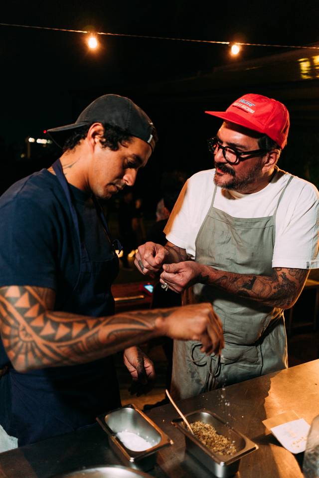 Já está virando tradição os eventos no rooftop da Deus Mansion com muita música de qualidade, entusiastas da marca de várias tribos e rango de primeira, dessa vez tendo @cantineirosmokemaster do @borgomooca como convidado do nosso chef @dario_costa. O evento começou ao som do @djnovset, figurinha carimbada da casa, seguido pelos endiabrados @filippe_dias Trio, bem conhecidos por essas bandas também, e finalizando com a participação de outra querida da marca, @gi_toledo que soltou a voz para encerrar mais uma grande festa. Na parte gastronômica, o chefs prepararam Calzones de polvo em salsa matriciana feitas na braza, canjiquinha de guanciale, camarão e lula, e milho na brasa com maionese de tofu – alguns nomes difíceis de explicar, mas quem comeu entendeu!