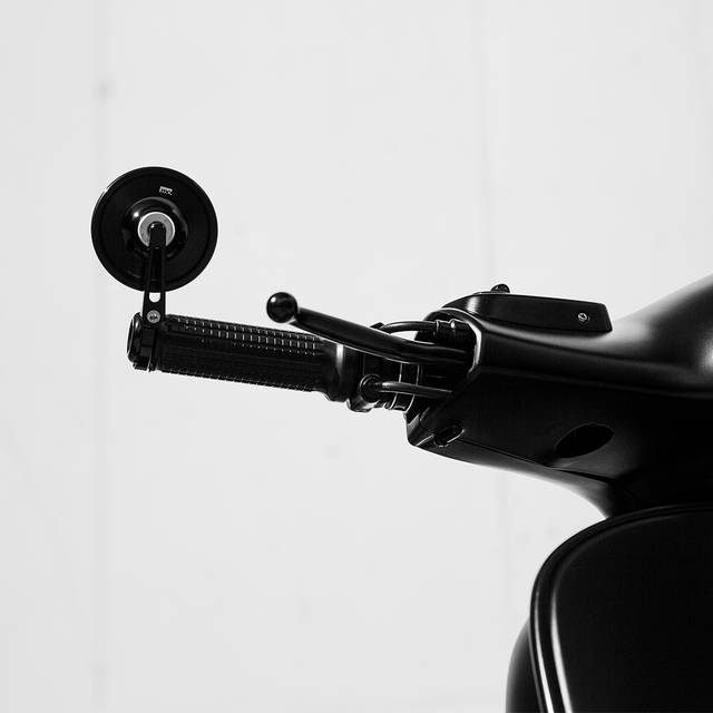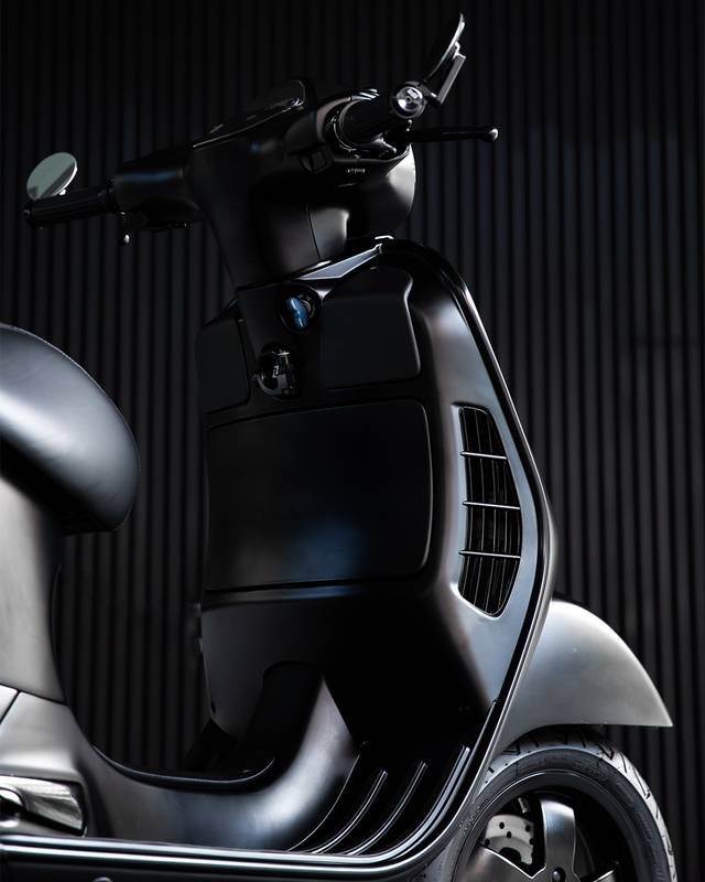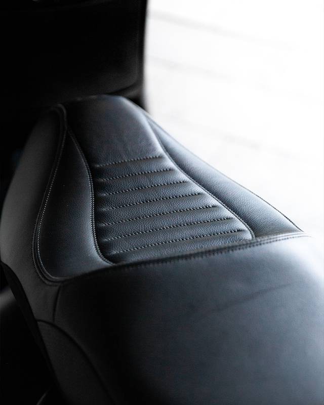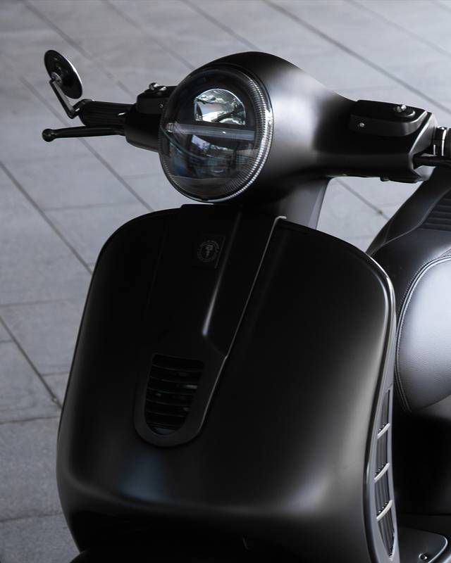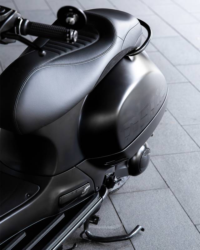 Para combinar com a carroceria refinada, o painel de controle recebeu atualizações modernas e sutis - um painel digital SIP, manoplas Motogadget, botões de controle, espelhos nas extremidades do guidão e um farol de LED escurecido. O quadro foi pintado em preto acetinado com toques de brilho, um trabalho primoroso da Colourfuel. O banco, elevado discretamente na parte traseira para maior conforto em viagens longas, foi finalizado com uma combinação de couro liso, perfurado e Alcântara, costurado para acompanhar as linhas naturais da Vespa. Detalhes em pintura eletrostática nos manetes de freio e no descanso lateral amarram o projeto com perfeição.