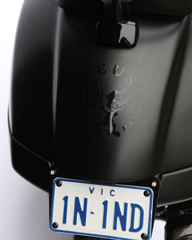 Reduzida à sua essência, Jeremy começou o trabalho alisando e melhorando as proporções dos piscas traseiros originais e da lanterna, criando um fluxo contínuo do banco até a traseira. Abaixo do para-lama traseiro ajustado, a placa foi estrategicamente posicionada entre luzes ultrafinas da Kellermann - tão discretas que praticamente pedem desculpas por existir.